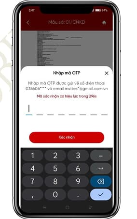Bước 6: Hiển thị màn hình nhập mã OTP, NNT thực hiện nhập mã OTP được gửi về email. Nhấn nút Xác nhận