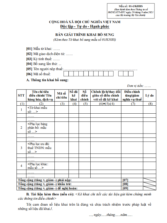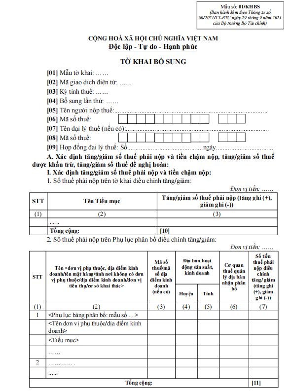 – Tờ khai bổ sung theo Mẫu 01/KHBS ban hành kèm theo Thông tư 80/2021/TT-BTC: