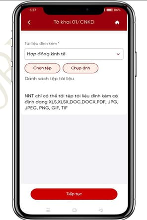 Bước 5: Hiển thị màn hình đính kèm, NNT thực hiện đính kèm các file định dạng: Doc, docx, excel, pdf, ảnh. Nhấn nút “Tiếp tục”.